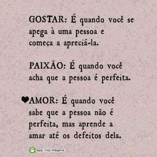AMOR: É quando você sabe que a pessoa não é perfeita, mas aprende a amar até os defeitos dela.