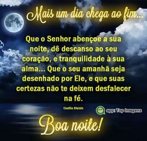Que o senhor abençoe a sua noite, dê descanso ao seu coração, e tranquilidade à sua alma... Que o seu amanhã seja desenhado por Ele, e que suas certezas não te deixem desfalecer na fé.