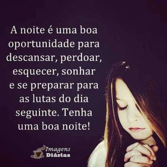 A noite é uma boa oportunidade para descansar, perdoar, esquecer, sonhar e se preparar para as lutas do dia seguinte. Tenha uma boa noite!