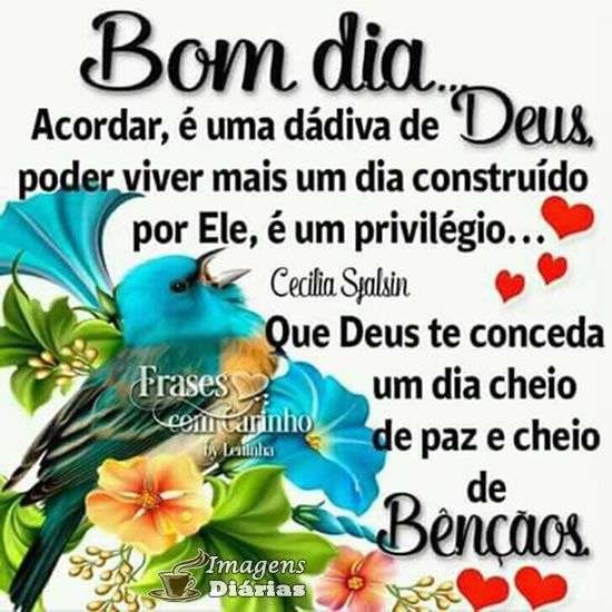Bom dia... Acordar, é uma dádiva de Deus, poder viver mais um dia construído por Ele, é um privilégio...Que Deus te conceda um dia cheio de paz e cheio de bençãos.