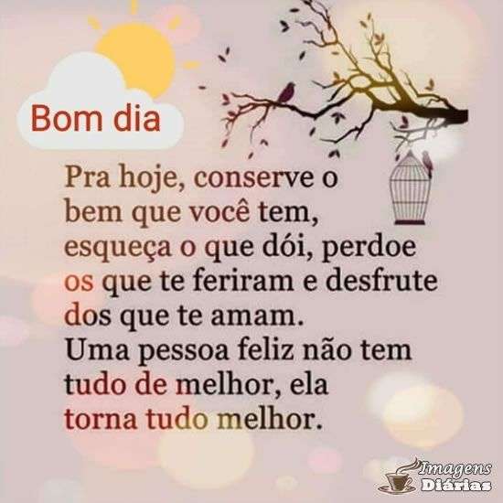 Pra hoje, conserve o bem que você tem, esqueça o que dói, perdoe os que te feriram e desfrute dos que te amam. Uma pessoa feliz não tem tudo de melhor, ela torna tudo melhor.