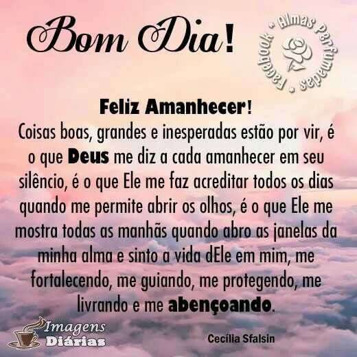Coisas boas, grandes e inesperadas estão por vir, é o que Deus me diz a cada amanhecer em seu silêncio, é o que Ele me faz acreditar todos os dias quando me permite abrir os olhos, é o que Ele me mostra todas as manhãs quando abro as janelas da minha alma e sinto a vida dEle em mim, me fortalecendo, me guiando, me protegendo, me livrando e me abençoando.