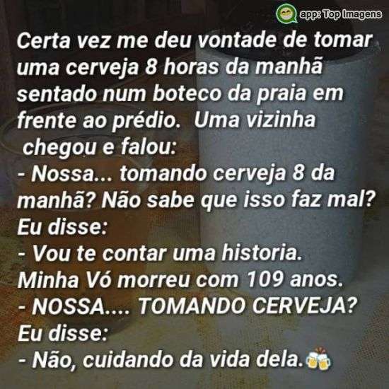 Certa vez me deu vontade de tomar uma cerveja 8 horas da manhã sentado num boteco da praia em frente ao prédio. Uma vizinha chegou e falou: