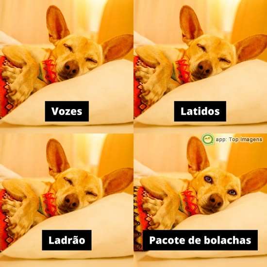 Cachorro dormindo com vozes, latidos e ladrão Cachorro acordando com pacote de bolacha.