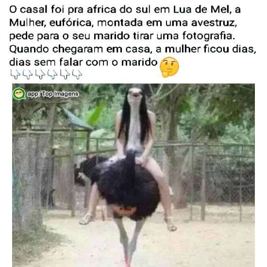 O casal foi pra Africa do sul em lua de mel, a mulher eufórica, montada em um avestruz, pede para seu marido tirar uma fotografia.