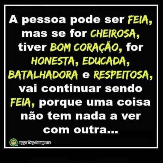 A pessoa pode ser feia, mas se for cheirosa, tiver bom coração, for honesta, educada, batalhadora e respeitosa, vai continuar sendo feia, porque uma coisa não tem nada a ver com outra...