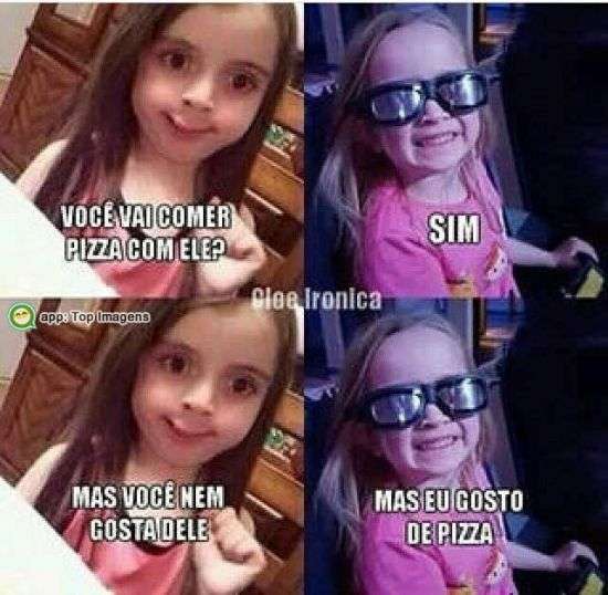 Você vai comer pizza com ele? Sim Mas você nem gosta dele Mas eu gosto de pizza