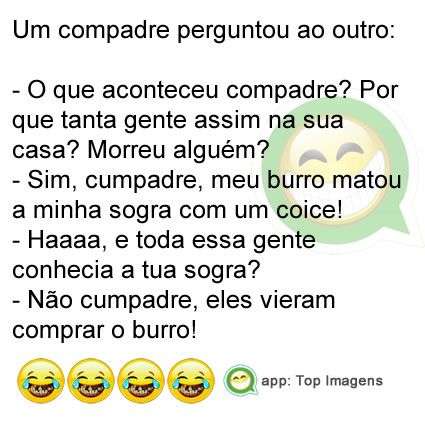 - Sim, cumpadre, meu burro matou a minha sogra com um coice!