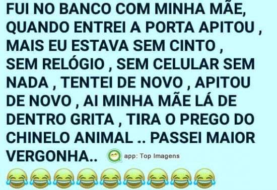 Fui no banco com minha mãe, quando entrei na porta apitou, mas eu estava sem cinto, sem relógio, sem celular, sem nada, tentei de novo, apitou de novo, ai minha mãe lá de dentro grita, tira o prego do chinelo animal...