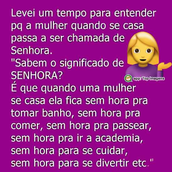 É que quando uma mulher se casa ela fica sem hora pra tomar banho, sem hora pra comer, sem hora pra passear, sem hora pra ir na academia, sem hora pra se cuidar, sem hora pra se divertir etc.