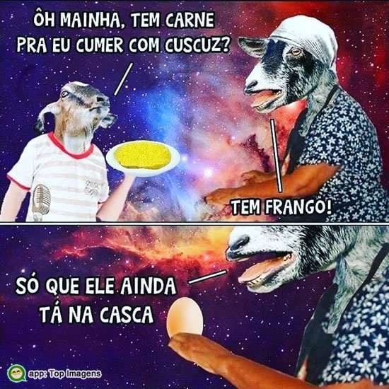 - Ôh mainha, tem carne pra eu cumer com cuscuz? - Tem frango! Só que ele ainda tá na casca.