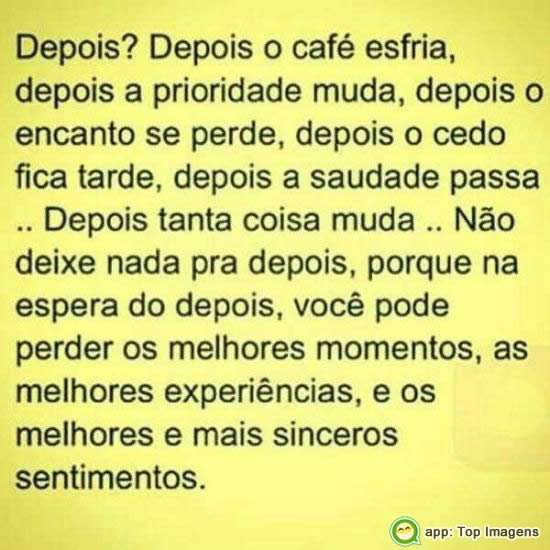 Não deixe nada pra depois, porque na espera do depois, você pode perder os melhores momentos, as melhores experiências, e os melhores e mais sinceros sentimentos.