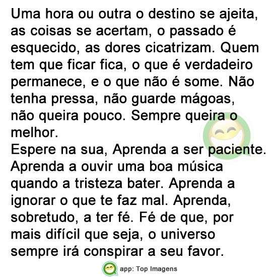Uma hora ou outra o destino se ajeita, as coisas se acertam, o passado é esquecido, as dores cicatrizam.