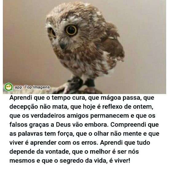 Aprendi que o tempo cura, que a mágoa passa, que a decepção não mata, que hoje é reflexo de ontem, que os verdadeiros amigos permanecem e que os falsos graças a Deus vão embora.