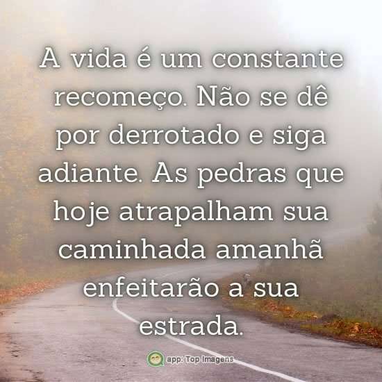 A vida é um constante recomeço. Não se dê por derrotado e siga adiante. As pedras que hoje atrapalham sua caminhada amanhã enfeitarão a sua estrada.