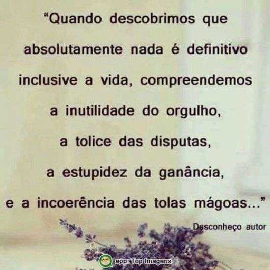 "Quando descobrimos que absolutamente nada é definitivo inclusive a vida, compreendemos a inutilidade do orgulho, a tolice das disputas, a estupidez da ganância, e a incoerência das tolas mágoas..."