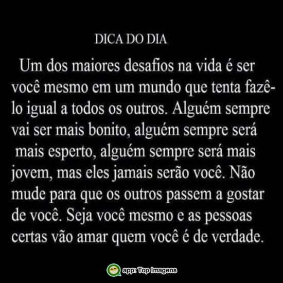 Um dos maiores desafios na vida é ser você mesmo em um mundo que tenta fazê-lo igual a todos os outros. Alguém sempre vai ser mais bonito, alguém sempre será mais esperto, alguém sempre será mais jovem, mas eles jamais serão você. Não mude para que os outros passem a gostar de você. Seja você mesmo e as pessoas certas vão amar quem você é de verdade.