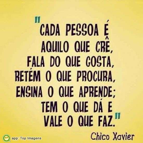 Cada pessoa é aquilo que crê, fala do que gosta, retém o que procura, ensina o que aprende, tem o que dá e vale o que faz.