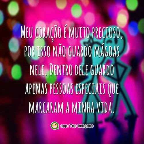 Meu coração é muito precioso, por isso não guardo mágoas nele. Dentro dele guardo apenas pessoas especiais que marcaram a minha vida.