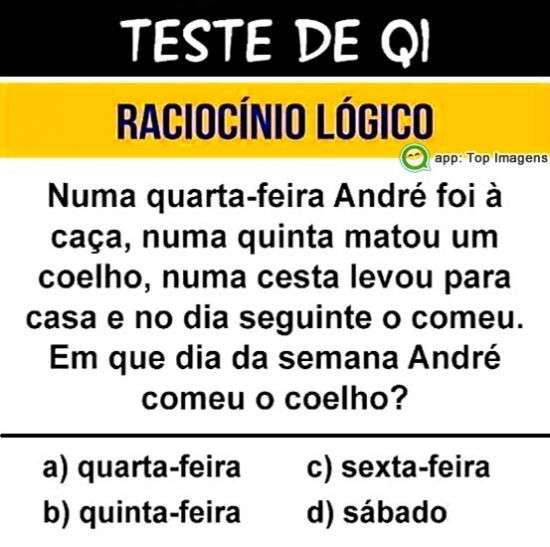 Numa quarta-feira André foi a caça, numa quinta matou um coelho, numa cesta levou para casa e no dia seguinte o comeu. Em que dia da semana André comeu o coelho?