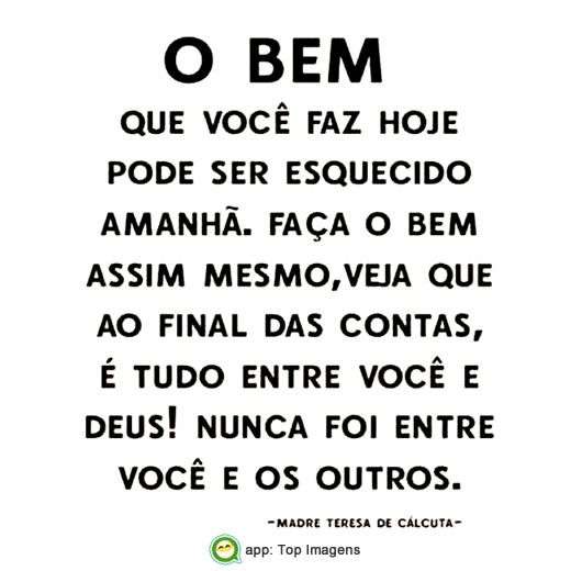 O bem que você faz hoje pode ser esquecido amanhã. Faça o bem assim mesmo, veja que ao final das contas, é tudo entre você e Deus! Nunca foi entre você e os outros.