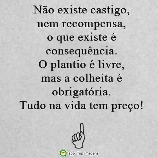 Não existe castigo, nem recompensa, o que existe é consequência. O plantio é livre, mas a colheita é obrigatória. Tudo na vida tem preço!
