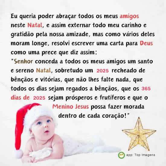 "Senhor conceda a todos os meus amigos um santo e sereno Natal, sobretudo um 2025 recheado de bênçãos e vitórias, que não lhes falte nada, que todos os dias sejam regados a bênçãos, que os 365 dias de 2025 sejam prósperos e frutíferos e que o Menino Jesus possa fazer morada dentro de cada coração!"