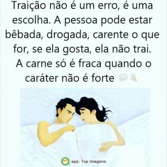 Traição não é um erro, é uma escolha. A pessoa pode estar bêbada, drogada, carente o que for, se ela gosta, ela não trai. A carne só é fraca quando o caráter não é forte.