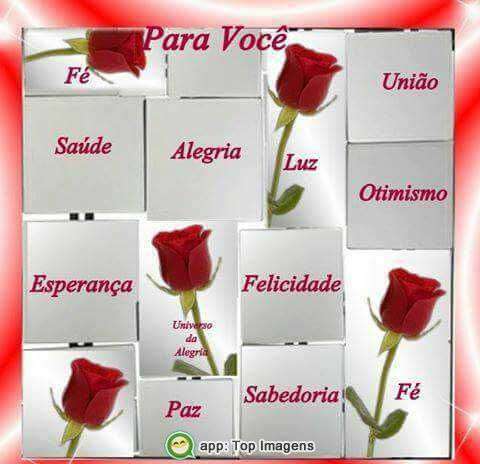Desejo para você: Fé, União, Saúde, Alegria, Luz, Otimismo, Esperança, Felicidade, Paz e Sabedoria.