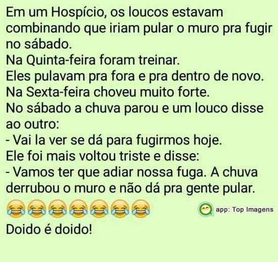 Em um hospício, os loucos estavam combinando que iriam pular o muro pra fugir no sábado.