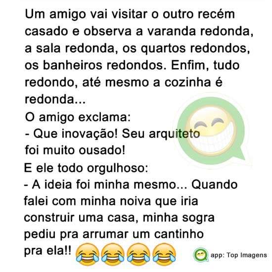 Um amigo vai visitar o outro recém casado e observa a varanda redonda, a sala redonda, os quartos redondos, os banheiros redondos. Enfim, tudo redondo, até mesmo a cozinha é redonda...