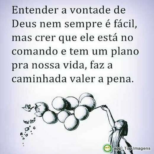 Entender a vontade de Deus nem sempre é fácil, mas crer que ele está no comando e tem um plano pra nossa vida, faz a caminhada valer a pena.