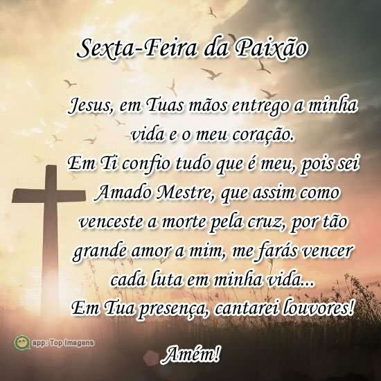 Em Ti confio tudo que é meu, pois sei Amado Mestre, que assim como venceste a morte pela cruz, por tão grande amor a mim, me farás vencer cada luta em minha vida...